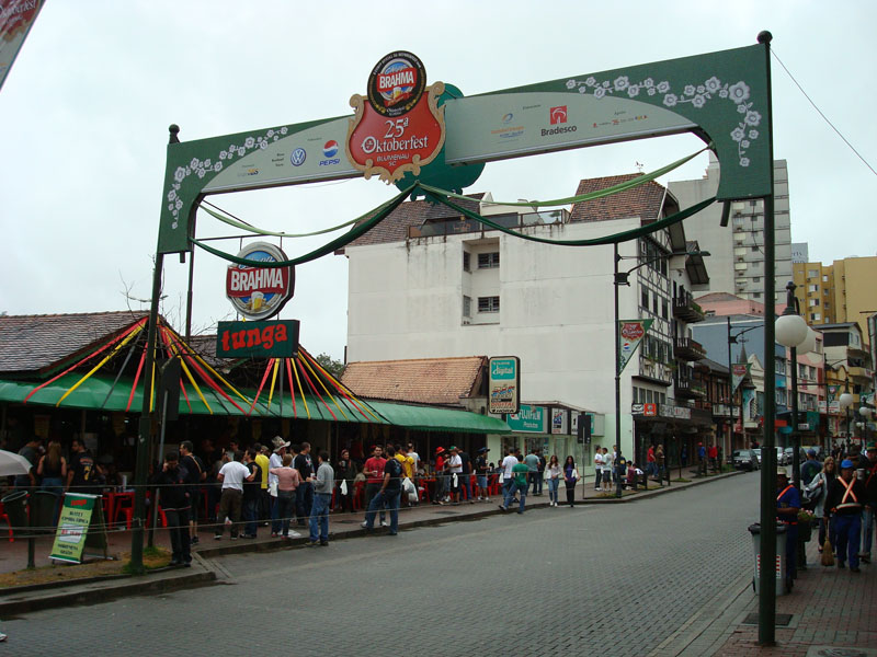 Kategorie Am Wochenende war ich auf dem zweitgroessten Bierfest der Welt (nach dem Muenchner Oktoberfest). Dies findet jedes Jahr in Blumenau statt. Blumenau hat ca. 300 000 Einwohner und liegt im Brasilianischen Bundesstaat Santa Catarina. Die Stadt wurde 1850 von deutschen Einwanderern unter Leitung des Apothekers Hermann Blumenau gegruendet. Noch heute kann man die deutsche Geschichte Blumenaus deutlich erkennen. Im Zentrum stehen viele Fachwerkhaeuser, an den Geschaeften sieht man deutsche Namen und viele Leute in Blumenau koennen auch noch Deutsch sprechen.